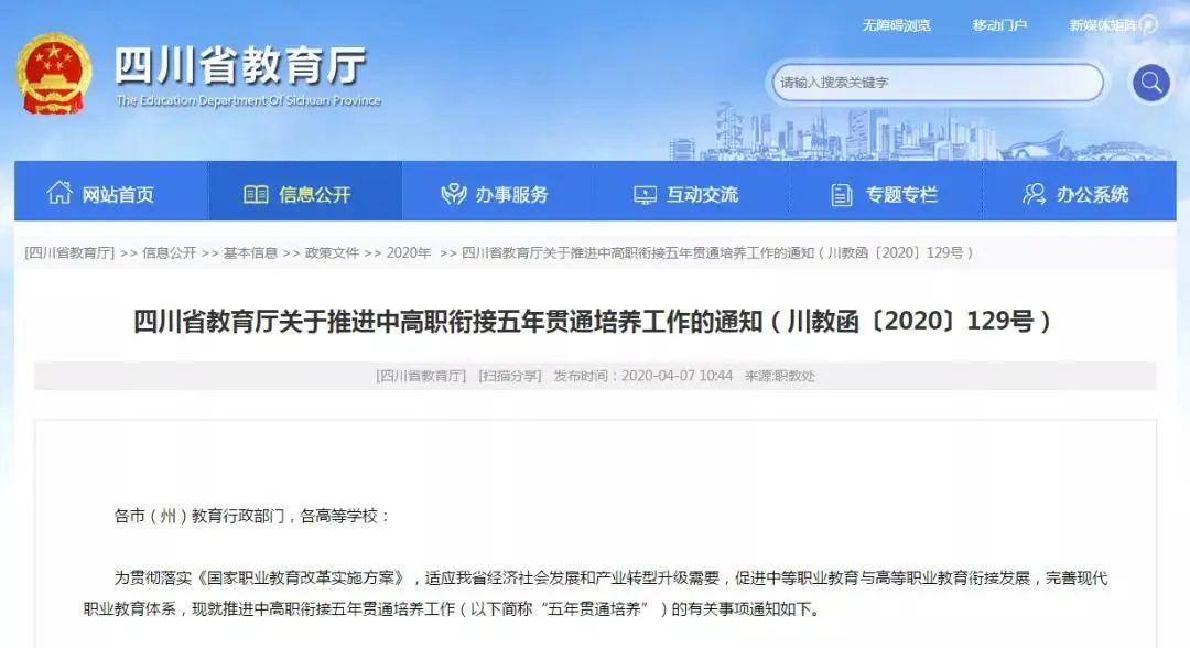 2020年4月7日,四川省教育厅发布了《四川省教育厅关于推进中高职衔接五年贯通培养工作的通知》。