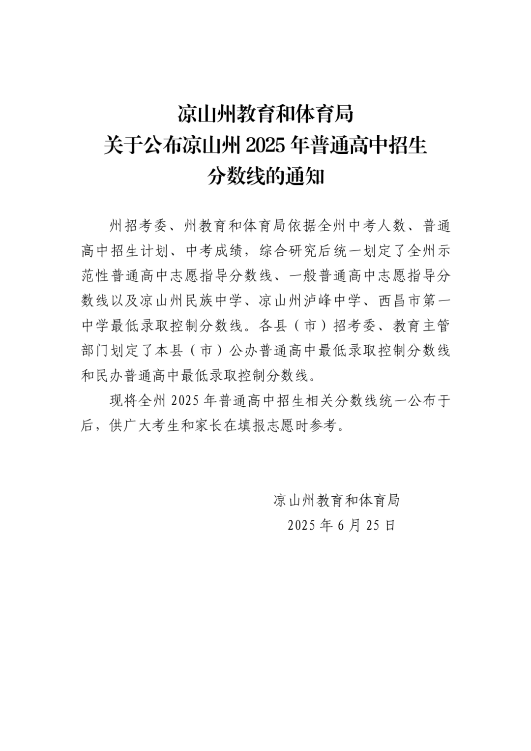 - 2025-10-06 凉山州教育和体育局关于下达2025年普通高中招生计划的公告