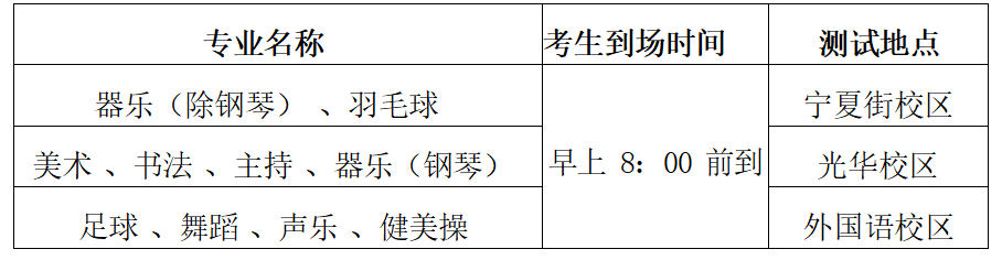 我校将按照公平、公正的原则组织专业测试,报考我校三校区同一个项目的考生均集中在其中一个校区测试,按照第一志愿、第二志愿测试时间分别进行。测试当天家长无特殊原因不进入考点,考生一律不携带手机 、电子手表等电子通讯设备进入考点。