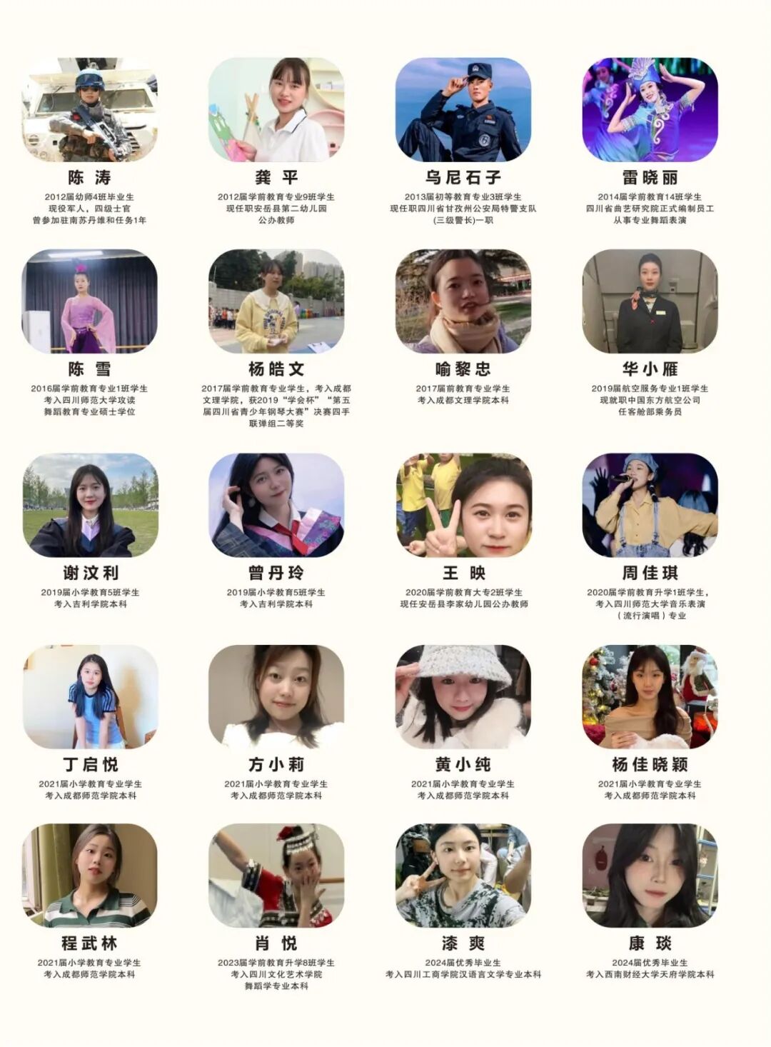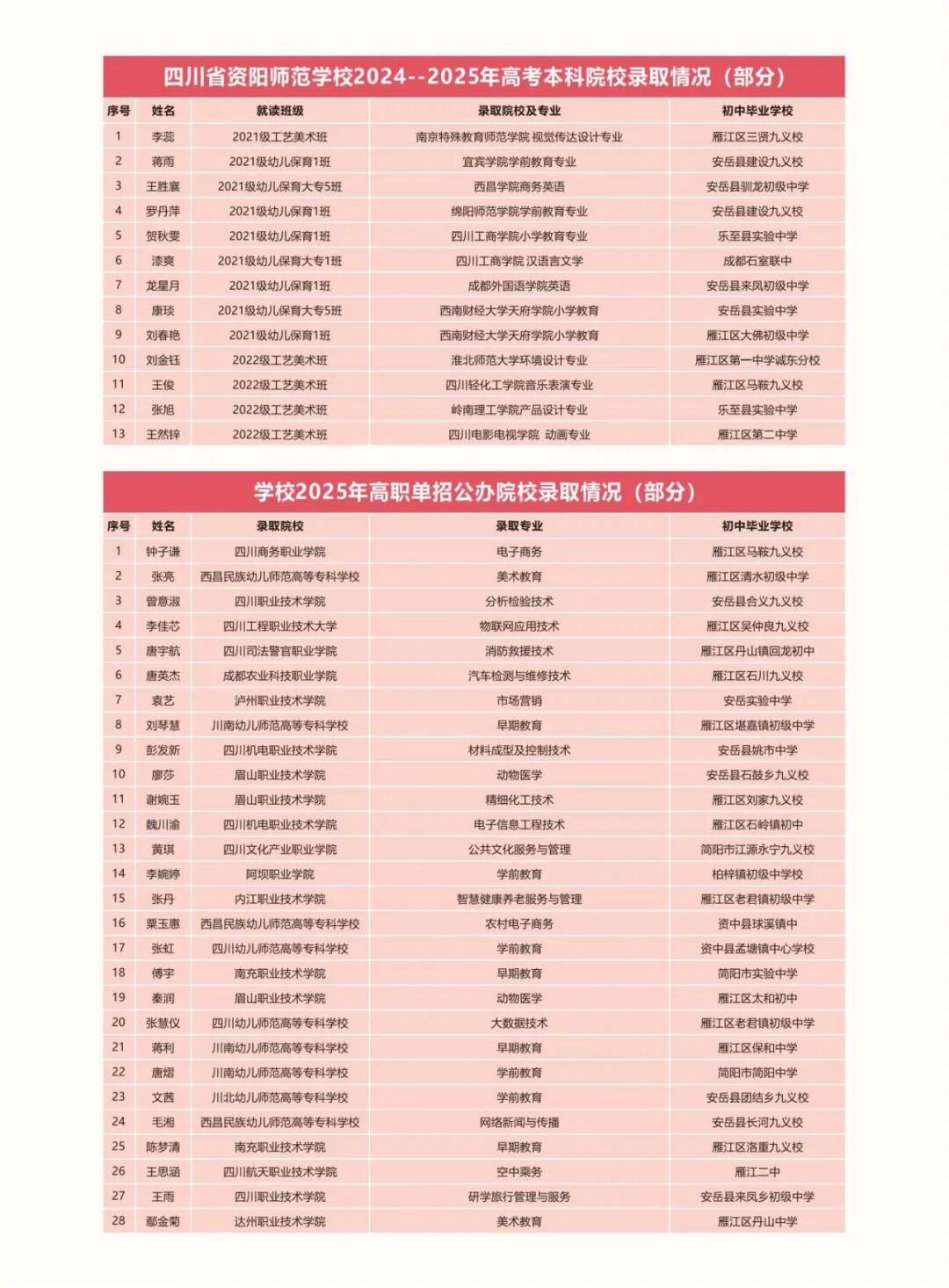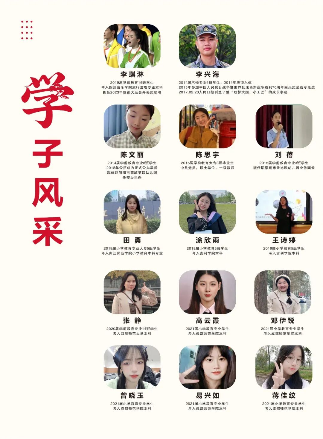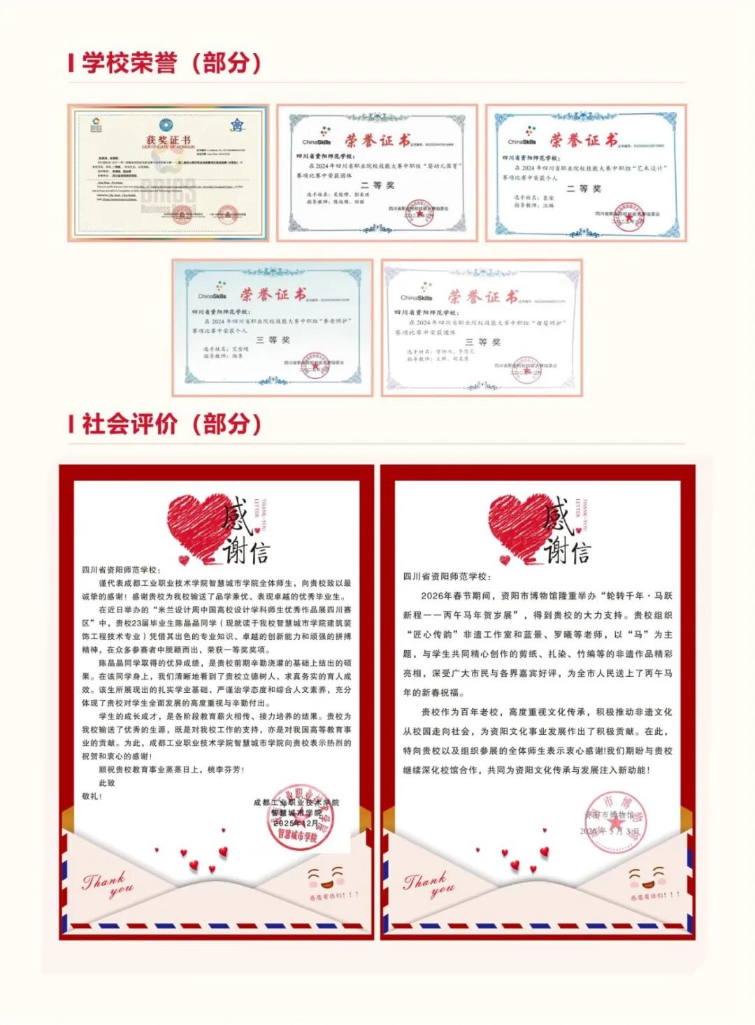 中高职贯通培养班:与川南幼儿师范高等专科学校、内江职业技术学院、四川科技职业学院、天府新区旅游航空职业学院联合开展“3+2”中高职五年贯通培养,与四川音乐学院成都美术学院、四川航天职业技术学院签订战略合作协议。