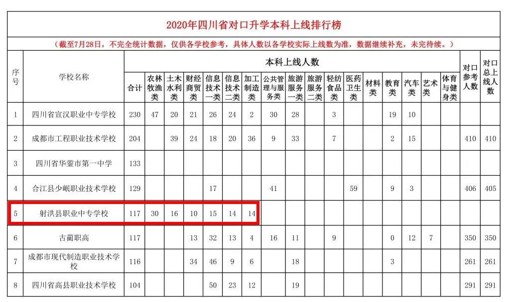 截至7月28日,不完全统计数据,《2020年四川省对口升学本科上线排行榜》中,射洪市职业中专学校单招后参加高考200人,117人上本科线。高考本科上线全省排名第五!