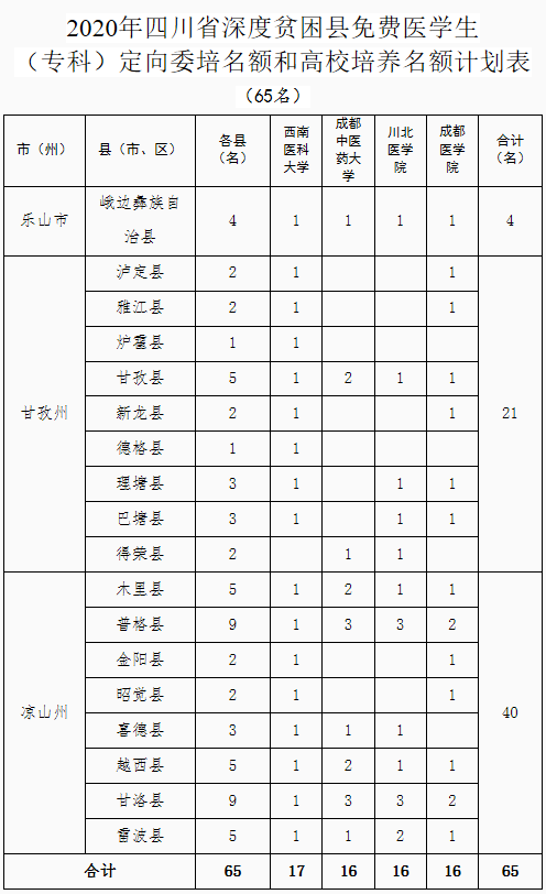 根据“三州一市”深度贫困县需求,2020年定向委培名额共65人,其中乐山市4人、甘孜州21人、凉山州40人。培养专业为临床医学(专科),学制三年。由西南医科大学、成都中医药大学、川北医学院和成都医学院4所高校承担培养任务,其中西南医科大学培养17人,成都中医药大学、川北医学院、成都医学院3所高校各培养16人。各高校在核定的2020年招生计划编制内分专业计划。定向委培名额和高校培养计划见附件。