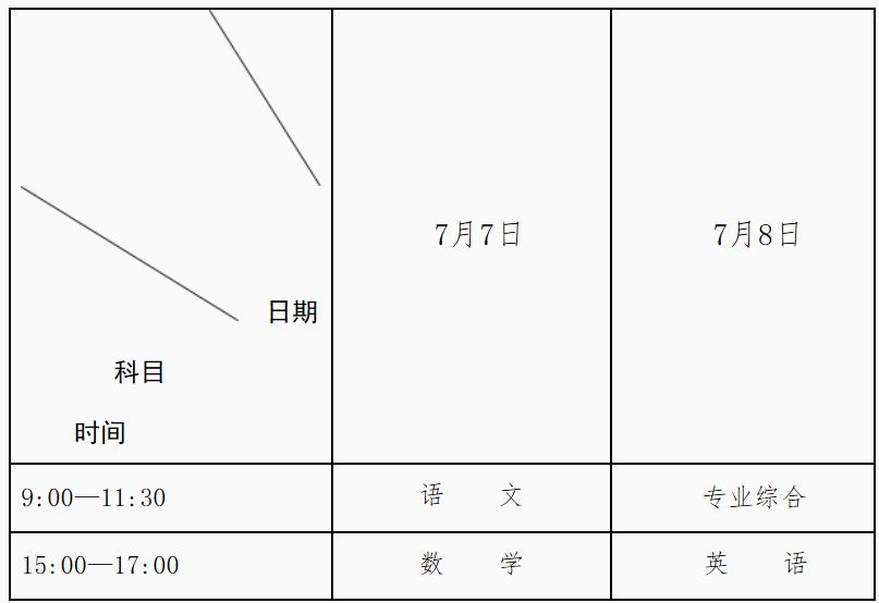 考试科目分为文化考试科目和专业综合科目两部分,总分为750分。文化考试科目为语文、数学、英语(不含听力考试内容)三科,语文、数学科满分为150分,英语科满分为100分;专业综合科目包含专业基础和专业应用方面的内容,满分为350分。