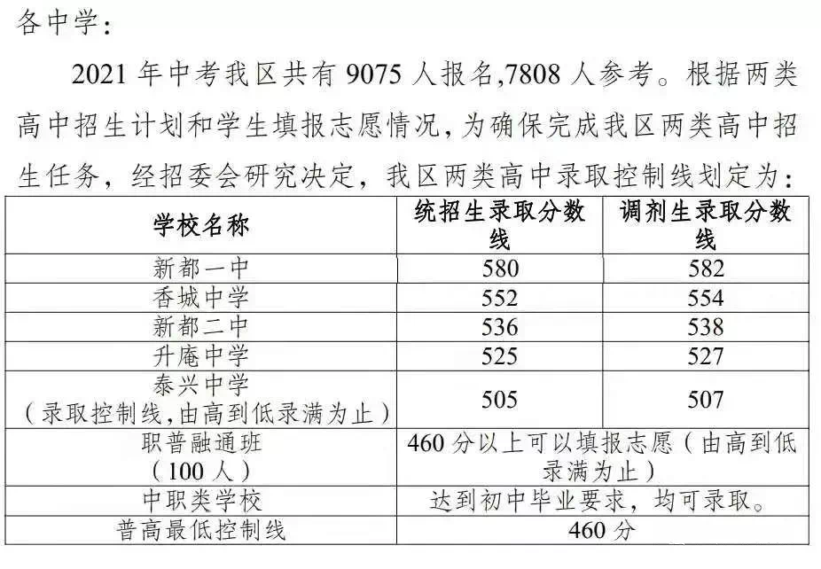 2021新都区区内高中中考划线如下: