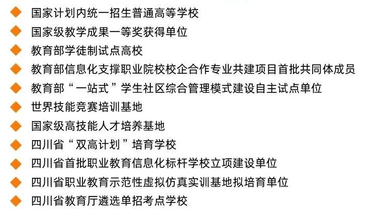 学校内涵建设成果丰硕,2021年被列为四川省高水平高等职业学校;2022年获职业教育国家级教学成果一等奖;2023年获批四川省首批职业教育信息化标杆学校立项建设单位。