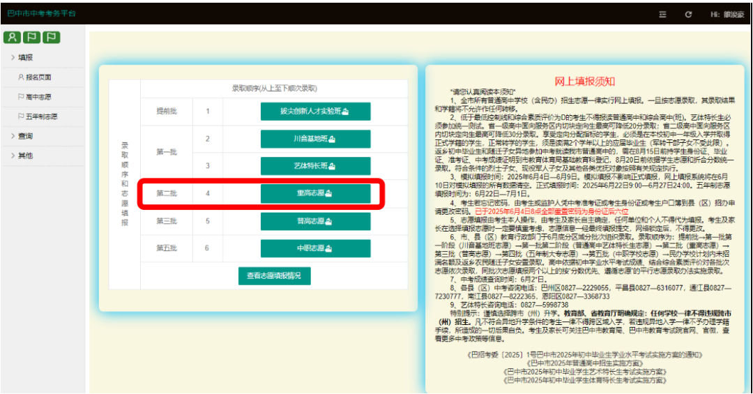 1. 市直属、巴州区、恩阳区、经开区的本地参考考生填报方式按《巴中市2025年高中阶段教育学校招生网上志愿填报办法》规定,中考分数发布后,考生登录https://zk.bzszb.cn/进入考生服务平台,务必在第一批第二阶段(普通高中艺术体育特长生志愿)、第二批次 (重高志愿)、第三批次(普高志愿)的A志愿均填报“巴州区六中”(通过艺术特长生、重高、普高录入学校就读的学生,根据中考成绩,按照班级设置编排计划同步对应编入艺术特长生班、拔尖创新人才实验班、鹏程班和平行班就读)。考生如果A志愿填报了巴州区六中,但未被录取,不影响后续志愿的录取,但A志愿未填报巴州区六中,即使分数超过了巴州区六中的录取线,巴州区六中也无法录取。