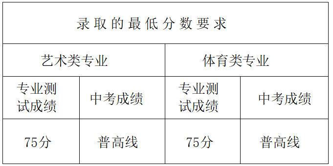 艺体特长生招生纳入第一批录取,第一批次各类别录取实行依次投档、顺位替补,被前面类别录取的考生不再参加以后类别的录取。在艺体特长生(第5类)录取时,在专业测试成绩、中考成绩均达到最低分数要求且未被前面各类录取的考生中,分专业按志愿优先的原则,依据调档分进行投档录取。