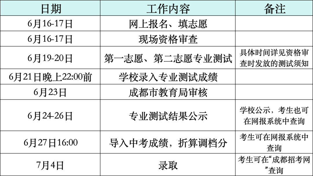 专业测试后,学校在规定的时间内将所有参加测试考生的专业测试成绩表等相关材料报成都市教育局审核。审核通过后,考生即可在网上查询,学校同时将在学校校门口公示考生专业测试结果。