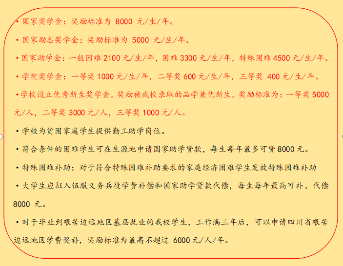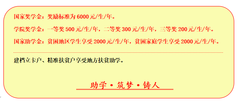 (一)学校设有国家奖学金、学院奖学金、国家励志奖学金、国家助学金等奖助项目,用于资助品学兼优、家庭经济困难的在校学生。