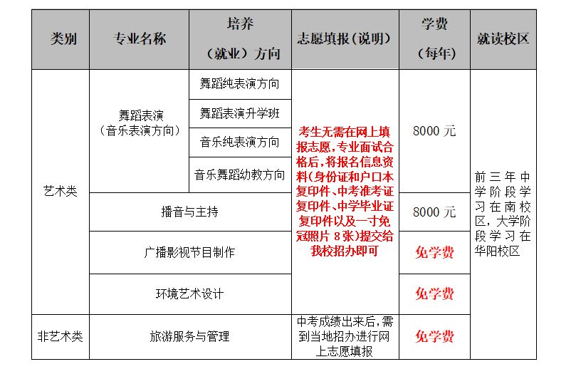 艺术类专业按国家教育部规定招生考试分为专业和文化考试,文化考试以中考成绩为准。